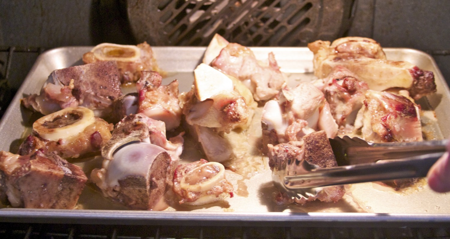 - Place the bones on a roasting pan and roast for 30 minutes, flip them over and roast for another 30 minutes.