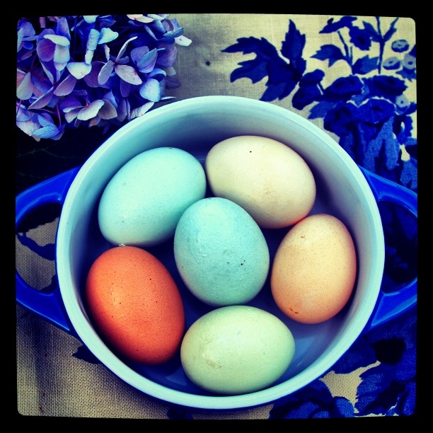 Eggs from “Easter Egger” chickens are gorgeous and they have been the subjects of many a private photo shoot at our house. The photo below is enhanced via Instagram but these are actual eggs that have not been colored or dyed. Amazing. Beautiful.