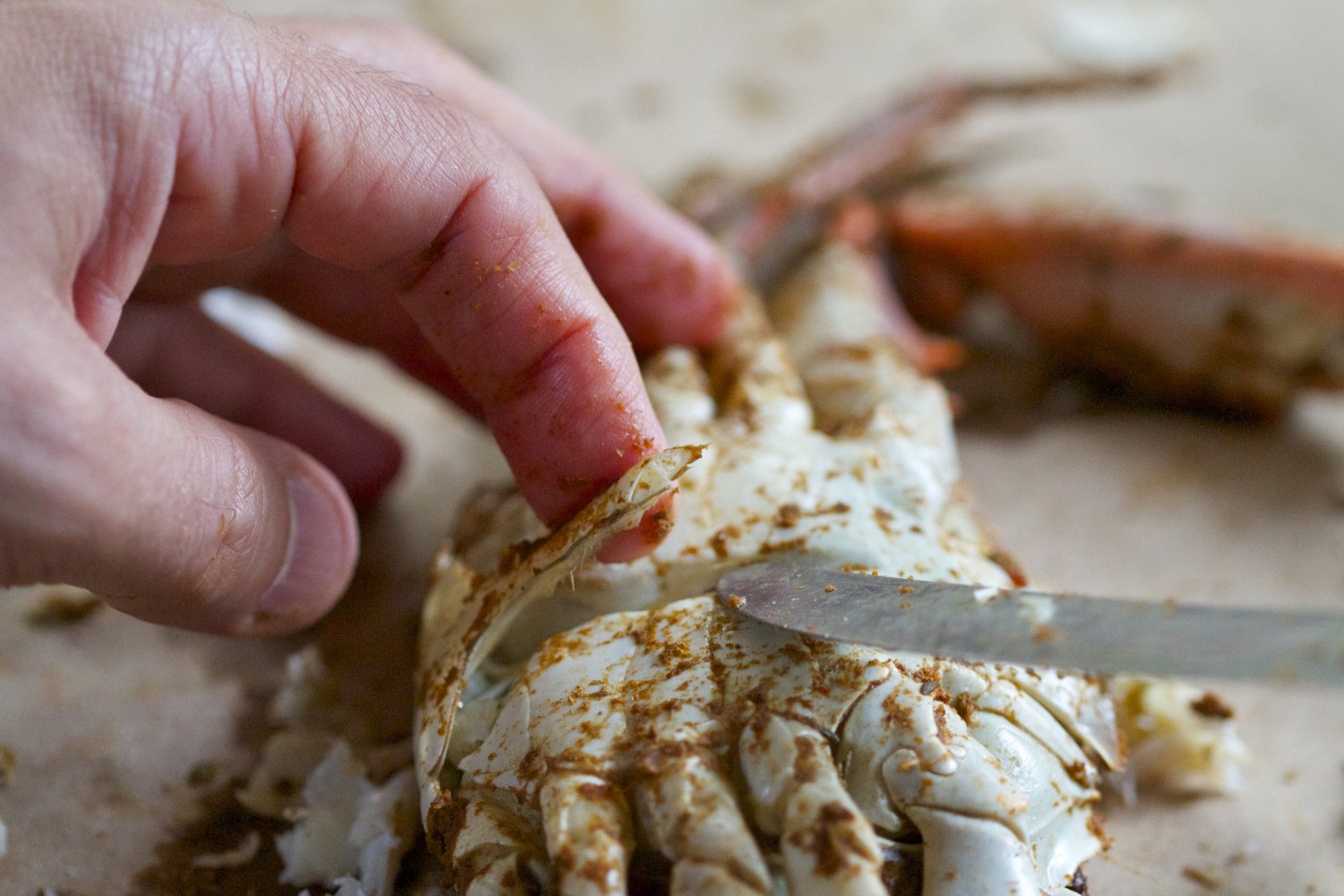 Then insert a knife (or use your hands) between the top and bottom halves of the crab’s body,