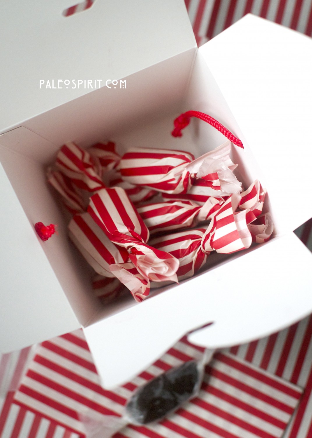 4. Invert the caramels onto a parchment covered cutting board, sprinkle with finishing sea salt of choice then cut caramel into desired size. Individually wrap the coconut sugar caramels in wax paper and then decorative paper of choice. paleo salted caramels