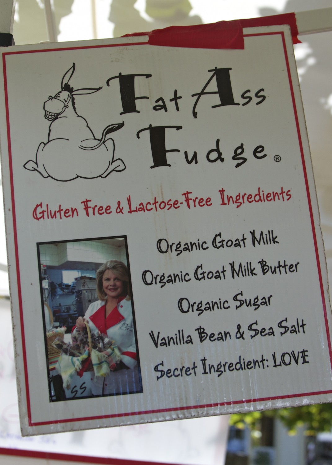 As we continued our exploration of the village, we came  upon a Farmer’s Market with some interesting finds. One of the standouts was Donna McCue of “Fat Ass Fudge”.